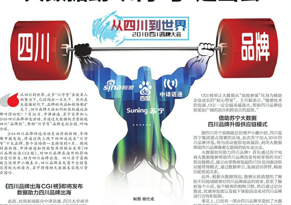 从四川到世界,众多“川字号”在数辈人的努力下,已经闯出一片天下。然而在大数据时代下,品牌的内涵和战场都扩大了,四川品牌又该如何抓住机遇让品牌叫得响呢?7月26日,中译语通、苏宁宣布加入2018四川品牌评选活动,并通过大数据的力量掀起四川“品牌热”,帮助“川字号”品牌走向全国,叫响全球。