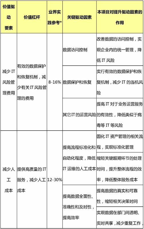 第一步:找到本项目的价值驱动要素,因为本项目属于内部项目,不能直接产生收益,只能通过提升管理效率和降低成本得到间接收益。
