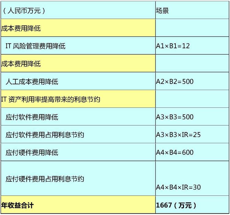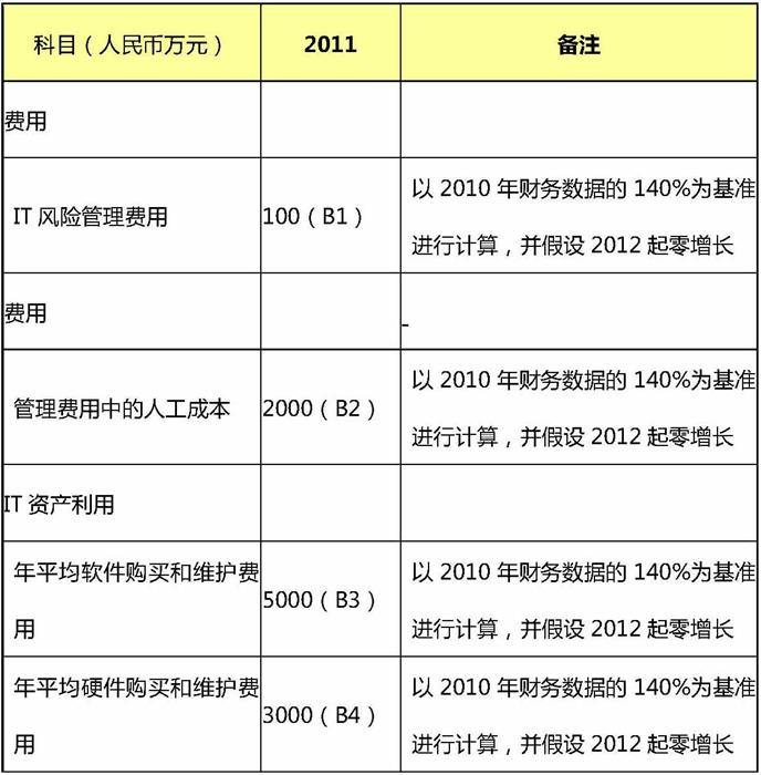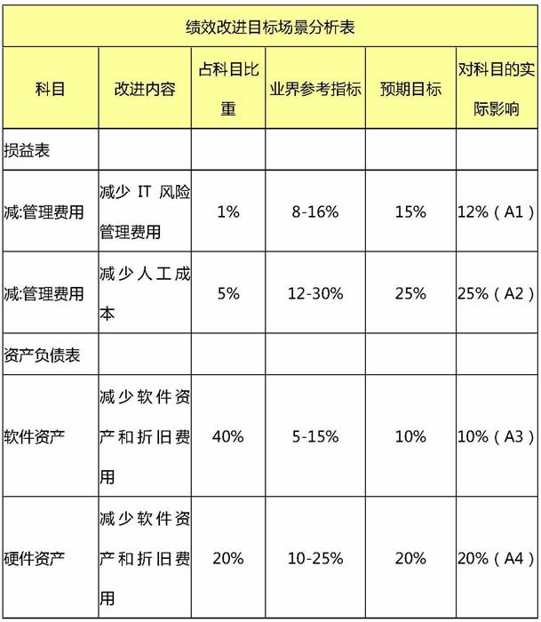 第二步:根据四个驱动要素——减少IT风险管理费用;减少人工成本;减少软件费用;减少硬件费用,选定相应的财务数据,即损益表的管理费用细项(减少IT风险管理费用和减少人工成本),以及资产负债表细项(软件资产和硬件资产),设定某场景下的预期目标,作为ROI分析的输入信息。把对科目的影响百分比分别记为A1, A2, A3, A4。