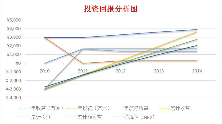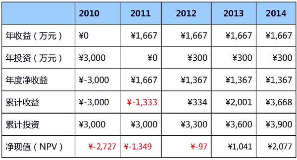 第五步:根据本项目的范围和计划,假定项目的投资回报的计算年限为5年,并且公司平均资本成本为10%(即为计算NPV的贴现率),初始投资为3000万,每年的维护费用为总投资的10%,即300万。