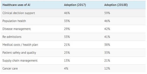 附注:AI在医疗领域的运用包括:临床决策支持、人口健康、疾病管理、重新入院、医疗费用/健康计划、患者安全和质量、供应链管理和癌症护理。