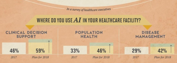 而在一项对医疗机构高管的调查中发现,在2017年,46%高管会在诊断支持方面运用AI技术,而2018年这个数据达到59%;在2017年,33%高管在人口健康方面运用AI技术,而到2018年增长到46%;在2017年,29%高管在疫病管理方面运用AI技术,而到2018年计划增加到42%。