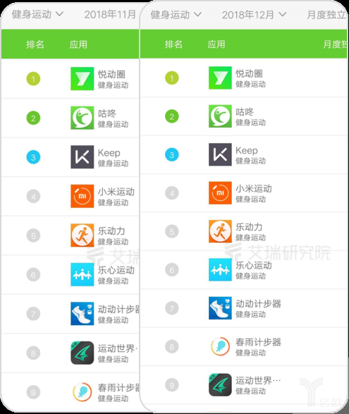 根据比达网统计的健身App月活跃用户数据显示,2018年第一季度,悦动圈以1805.7万人排名第一,咕咚以988.8万人跃居第二,Keep以897.7万人排名第三。