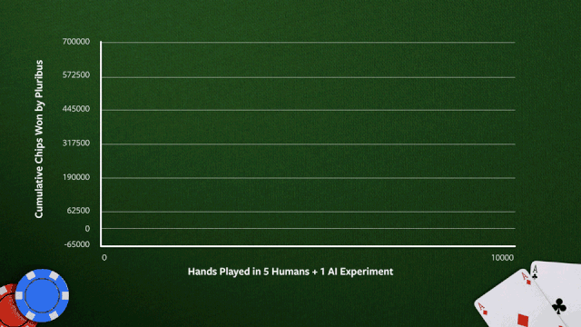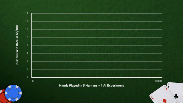 具体的测试中,研究者一共设计了两种牌局。一种是5个人类和一个AI,一种是5个AI和一个人类。每一手牌开始的时候,筹码是10000个,小盲50,大盲100。