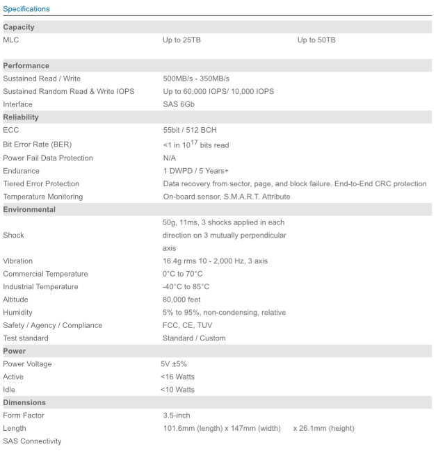 NAND,双端口 6Gbps SAS,3.5“标准外形尺寸。速度方面, UHC Silo SSD 的持续读写性能高达 500MB/s