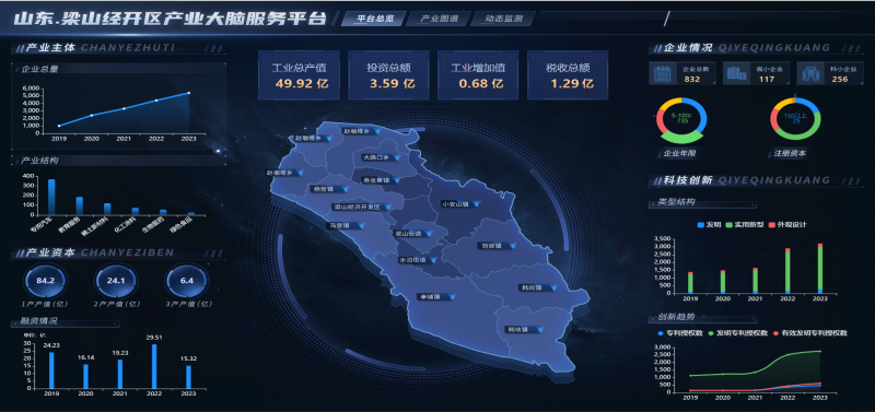 梁山专用车整车产业大脑运用云计算、大数据、人工智能、新一代信息技术,打造算力调度平台、数据汇聚平台、算法开发平台、服务开放平台。目前,已搭建并部署梁山云上经开平台、产业交易平台、专用汽车产业全景图谱及教辅教材产业全景图谱,通过数据中台和物联中台,实现工业数据的采集、分析和应用,整合工业数据及政府数据资源,为梁山经开区专用汽车行业发展提供数据资源支撑。