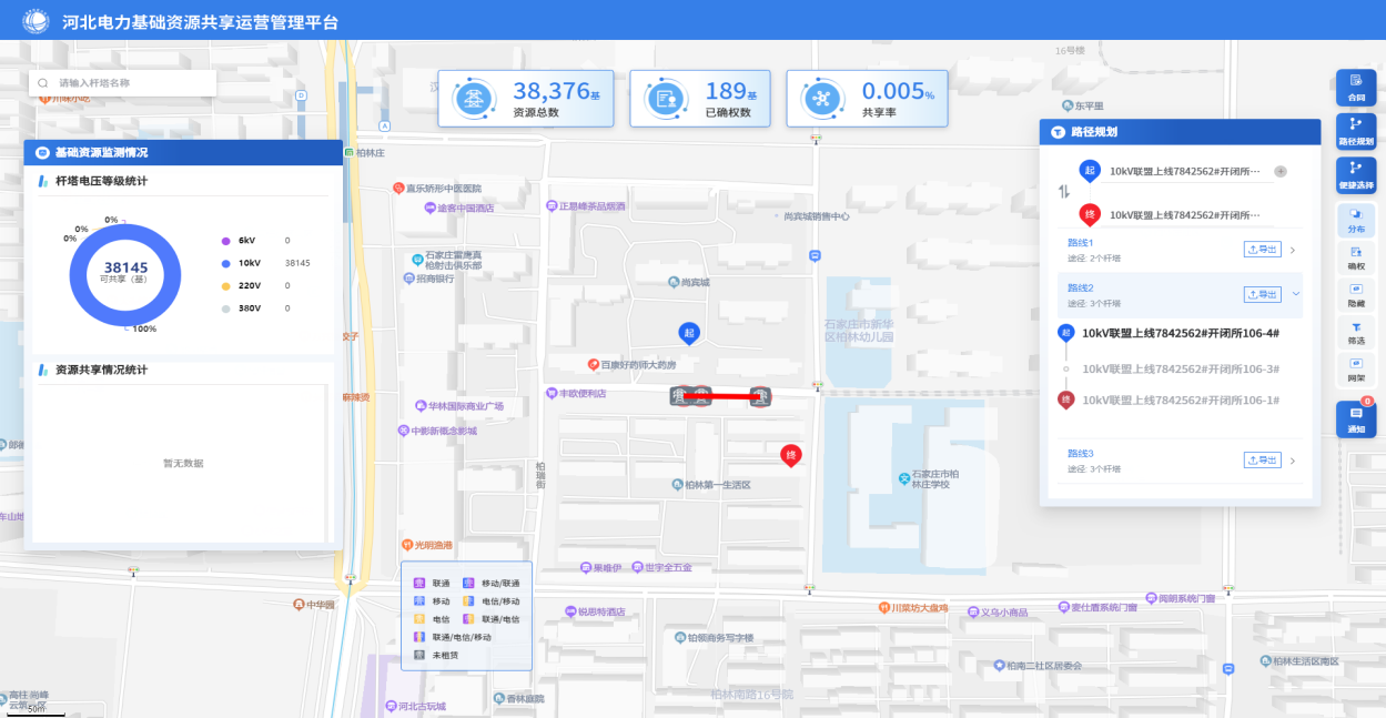 此外,通信线缆随意搭挂杆塔、产权界限不清、合同执行不到位等问题时有发生,不仅增加了安全隐患,也影响了电网供电的稳定性和服务质量。针对这些挑战,灵寿县分公司积极响应国网石家庄供电公司的号召,启动“多维多态电网一张图”项目,依托先进的信息技术和管理理念,力图打破传统管理壁垒,构建统一、高效、智能的基础资源共享运营新模式。