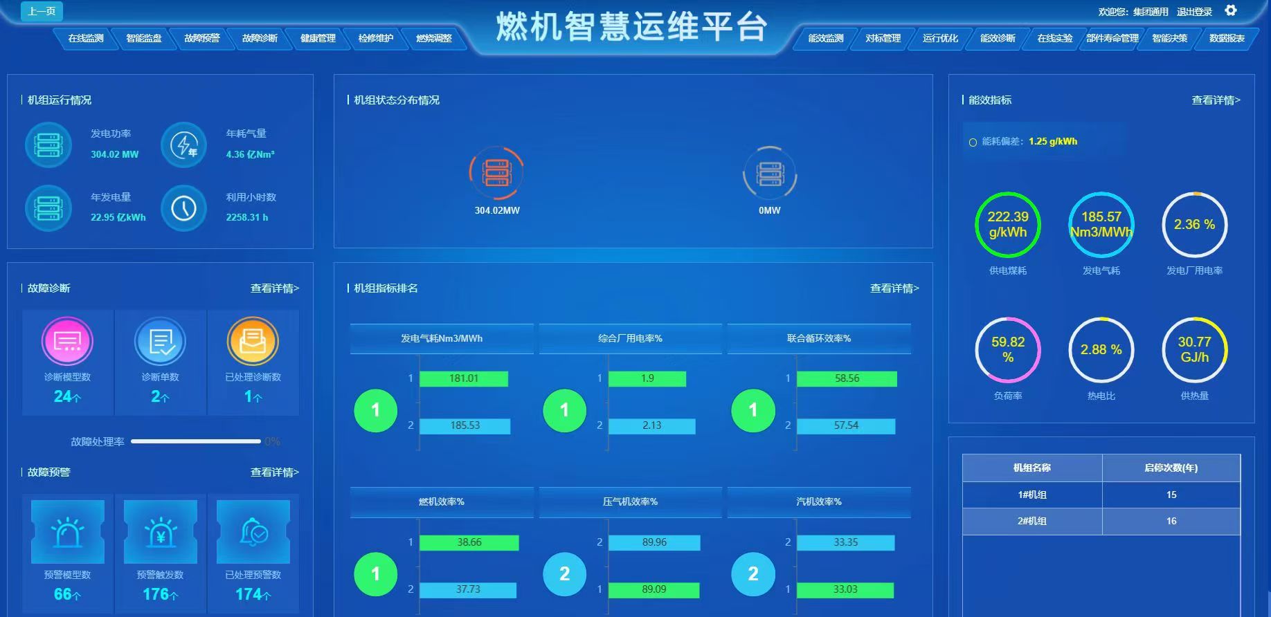 平台可有效诊断设备运行过程中存在的安全问题和能效问题,为机组的安全、可靠、经济运行提供保障。在预警诊断方面,平台平均每年提供一百余次的有效设备异常预警诊断信息,先后成功识别了燃机透平密封烧蚀、压气机叶片结垢、主机振动大、排气分散度大等设备结构及性能异常,最长提前58天识别到了相关设备的异常状态,有效避免了故障的扩大,减少了非停等事件的发生。在此基础上,针对常见故障类型提供了智能诊断,故障处理时间减少约20%-50%。在能效分析和运行优化方面,平台为发电机组关键系统实时提供经济运行决策建议,有效降低了机组发电能耗,平均提升发电机组效率约0.25%。据统计,近三年(2022-2024年)来,平台平均每年为发电企业带来经济效益约4600万元。