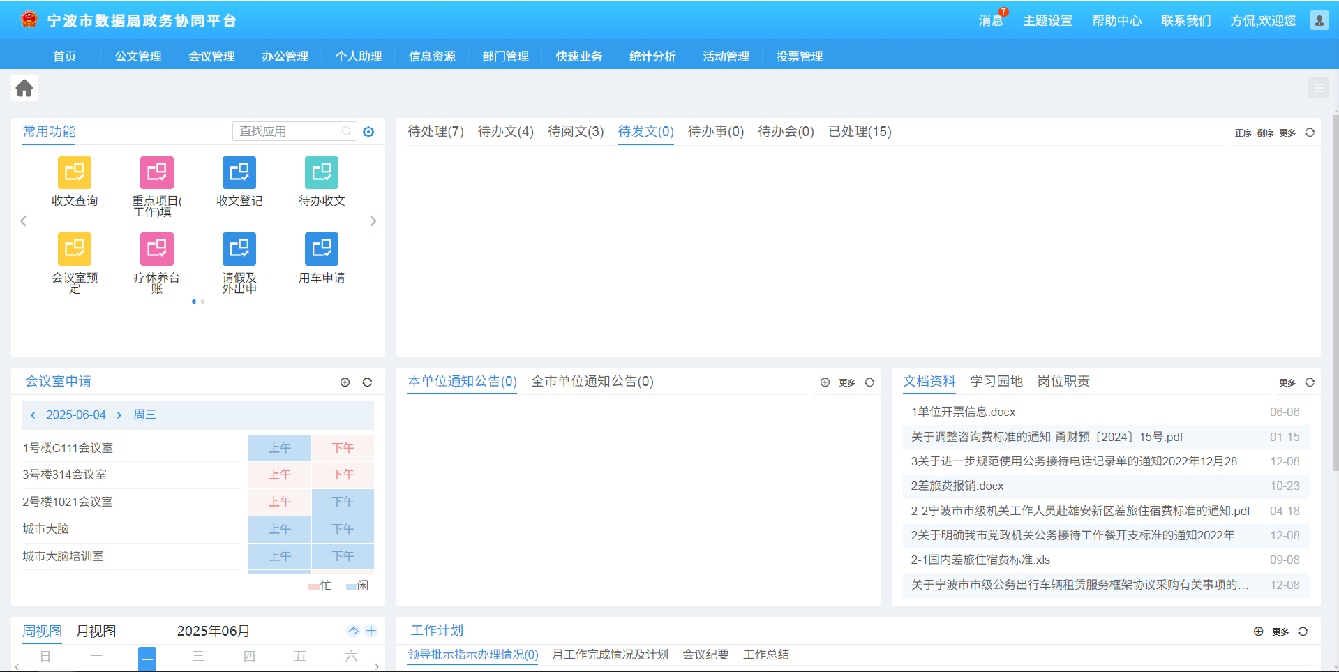 (三)办公管理。办公管理模块提供多种办公功能,可满足日常办公需求,主要包括文档管理、信息资源管理、内部邮件、领导日程、机关党建、学习园地、值班管理、信息报送、财务报销、合同管理、公车管理、假勤管理、活动管理等多个子项。功能间支持智能互联,如出差自动转报销,减少重复录入。支持领导视图,助力精准决策。