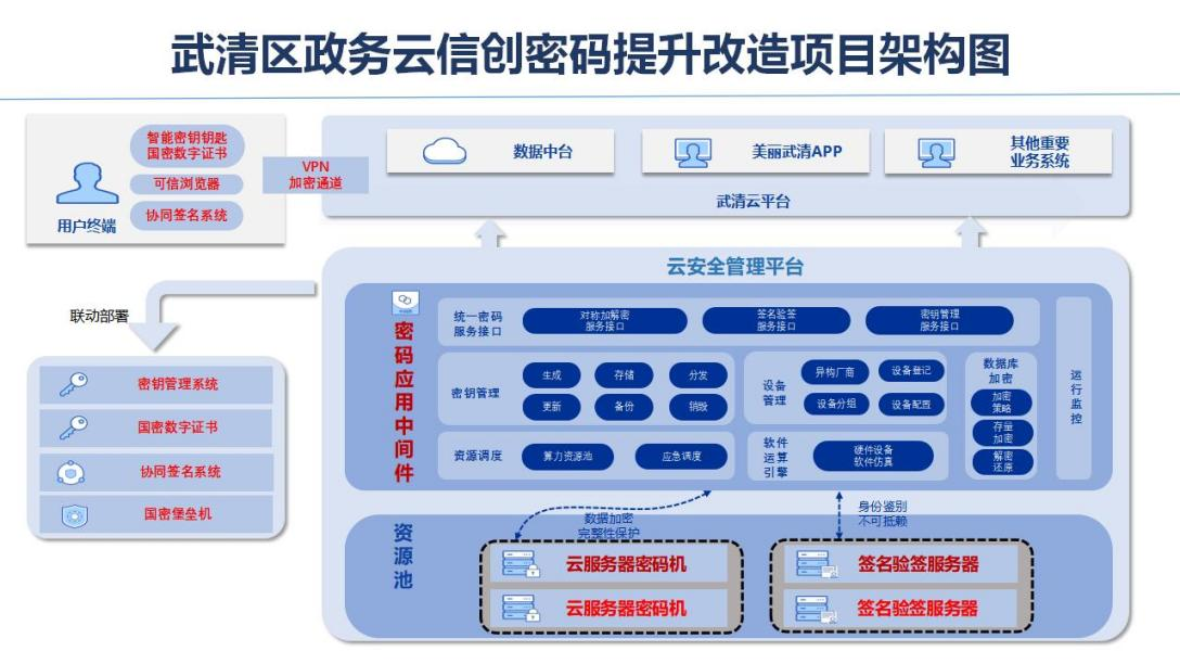 近年来,随着数字经济的快速发展,数据已成为关键生产要素。《数据安全法》《密码发》等一系列法律法规相继出台,明确强调密码在保障电子政务、电子商务安全以及保护公民个人信息等方面的核心支撑作用。武清政务云作为承载大量政务数据与业务的核心平台,其安全性直接关系到国家和公共利益。一旦发生数据泄露或被篡改,将严重影响政府公信力,甚至威胁国家安全。因此,通过密码安全提升改造,满足国家法规政策要求,成为武清区数据局的重要任务。