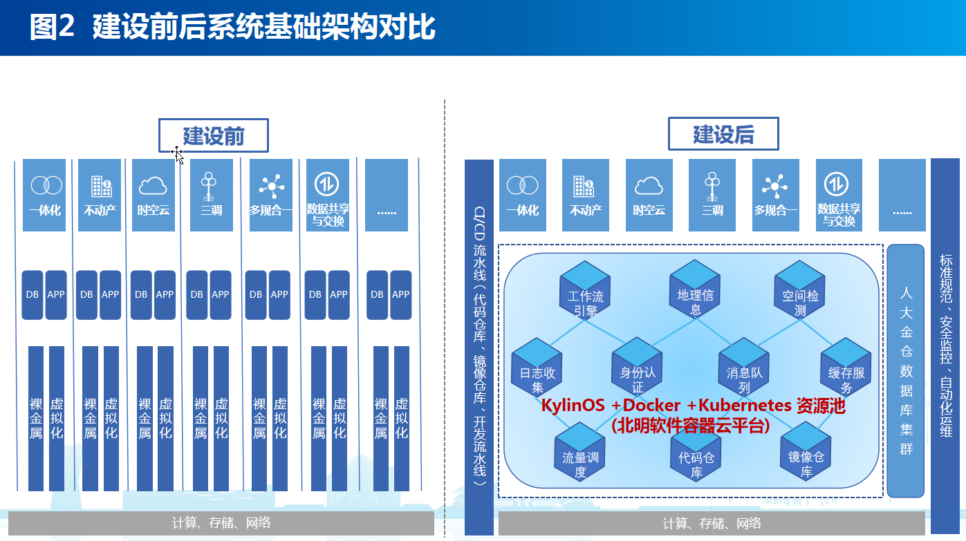二是全面引入微服务架构,提升应用适配改造效率。业务上,我们整合梳理原有应用功能,重构了规划和自然资源业务领域模型。技术上,我们全面引入微服务架构,剥离解偶通用组件,流量管理、GIS地图服务、身份认证、日志收集,消息队列、BMP引擎、空间检测、廉政风险防控等组件均以服务方式供不同应用按需组合调用,避免重复开发。此外,各应用系统也采用蓝绿策略发布,应用交付准备时间从原来的以周为单位变为持续开发持续集成,在不影响用户使用的情况下,各应用快速迭代,全局26个替代系统在不到1年的时间内全部实现单轨运行,满分通过省市验收。