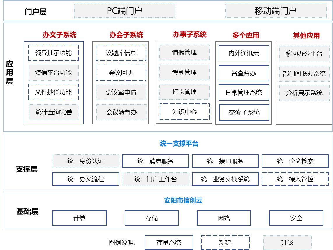 安阳市一网协同办公平台部署在安阳市信创云,平台建设核心理念是“共享协同”,业务流程以组件定制为特色,按照国家信创要求打造,做到了自主安全,全域可控。主要内容包括一个统一基础平台、两个体系(标准规范体系和安全保障体系)、三类业务(办文、办会、办事),N个应用(即时通讯、内部邮件、文件交换、督查督办等)。打造组织架构全面联通、政务办公全网协同、沟通协调全时在线、办公资源全量共享、系统平台全域可控的一体化协同办公平台,全面支撑政府网上办公、掌上办公、协同办公、智慧办公。