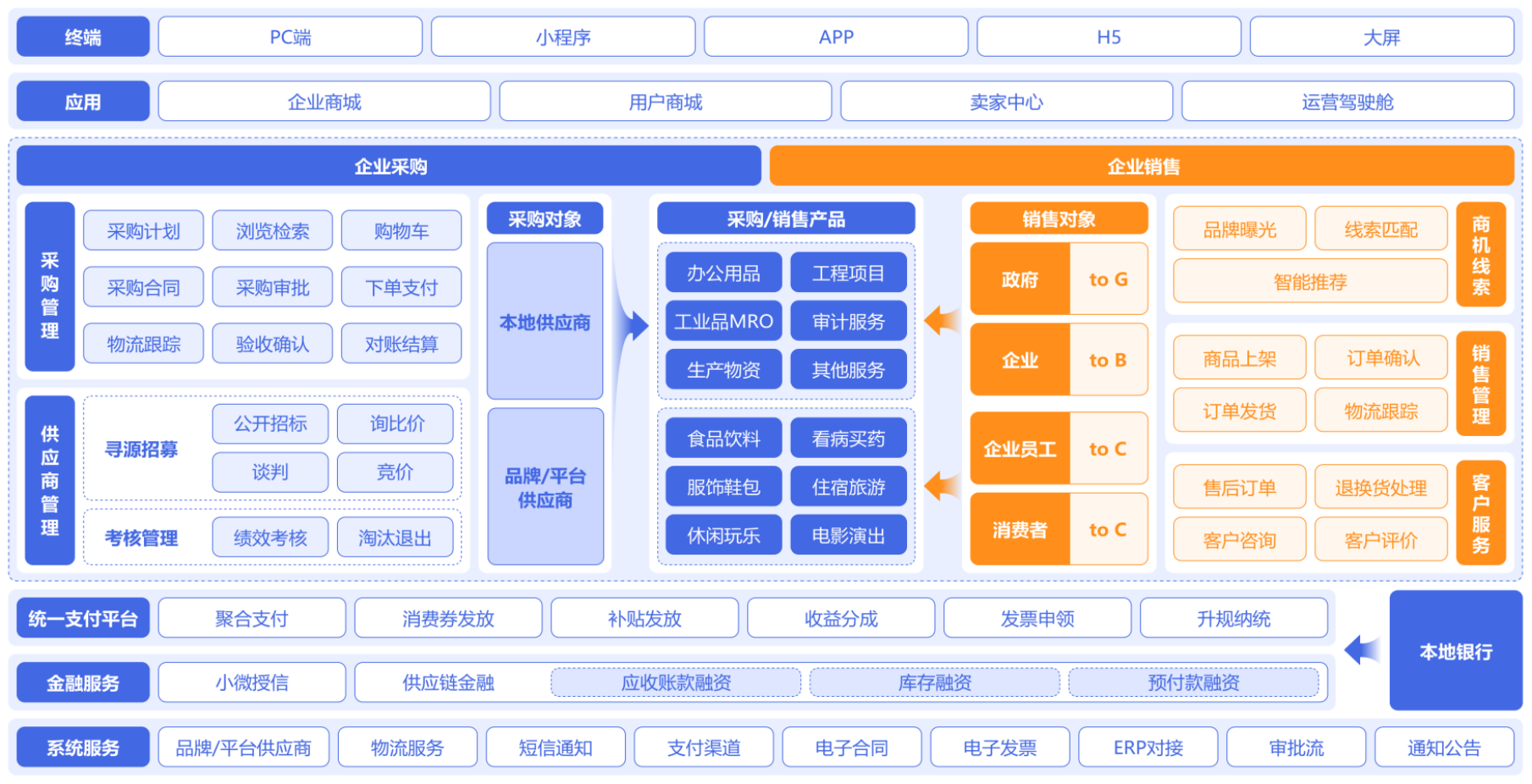 1.企业采购商城:聚焦B2B交易,为企业提供从寻源准入到履约交付的全流程数字化支持,助力企业降本、增效、合规、保供。