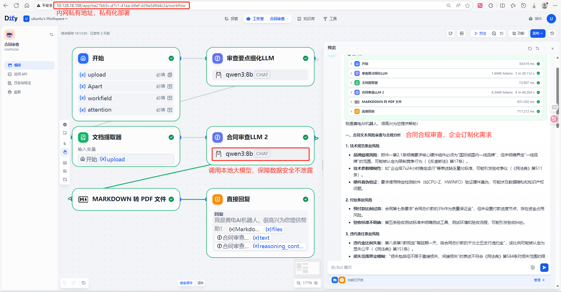 配图1:合同审查(dify开发平台Chatflow调试界面)