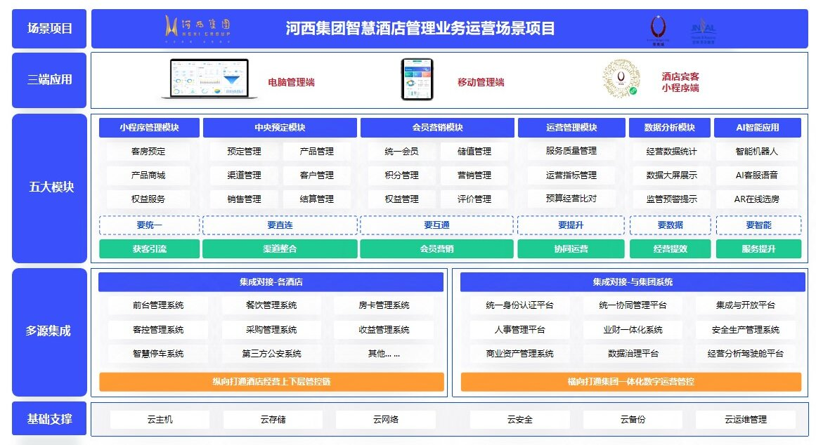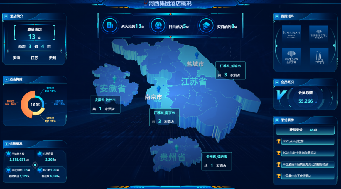 南京市河西新城区国有资产经营控股(集团)有限责任公司(以下简称“南京市河西集团”或“集团”)作为市属国资企业,以“一流城市综合服务运营商”为发展定位,形成了以开发建设和城市运营为主业,以产业投资支撑未来发展的“双主业一支撑”格局。酒店管理作为城市运营板块的重要组成部分,旗下运营13家酒店(含自有及外拓管理),客房3209间,年服务旅客超百万人次。当前,酒店行业面临着激烈的市场竞争,存在渠道管理分散,第三方渠道依赖高且佣金成本居高不下;会员数据碎片化,难以开展精准营销,无法挖掘会员价值;运营效率低下,人工管理耗时耗力,无法实时监控和优化运营流程;客户体验不佳,人力服务分配不均,影响客户服务满意度;数据信息孤岛,无法实现数据互联互通,缺乏数据驱动决策支撑的依据。南京市河西集团酒店管理同样面临这些问题,亟需通过数字化转型突破酒店管理与服务瓶颈,整合旗下酒店资源,实现统一管控和数据协同,实现酒店板块业务高质量发展。