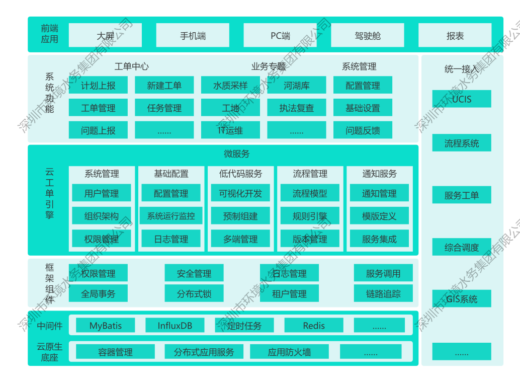 本项目聚焦超大型城市水务运营管理的数字化转型需求,融合云计算、大数据、人工智能、北斗导航等前沿技术,创新构建“云原生+核心引擎+多端协同”的水务工单一体化管理体系,攻克传统水务作业标准不统一、系统数据割裂、调度效率低、安全管控难等行业痛点,形成具有自主创新价值的技术成果,为水务行业数字化升级提供核心技术支撑,具体内容如下: