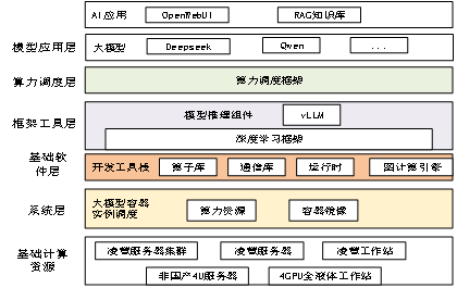 凌慧AH9280服务器集群不仅需完成底层集群的软件部署配置,还将集成DIfy、n8n、anythingLLM、RAGFlow、OpenWebUl、Neo4j、llamafactory等上层应用,打造“底层支撑-中层调度-上层应用”的完整技术体系,多层次协同工作以支持AI系统的开发、训练、推理及管理。