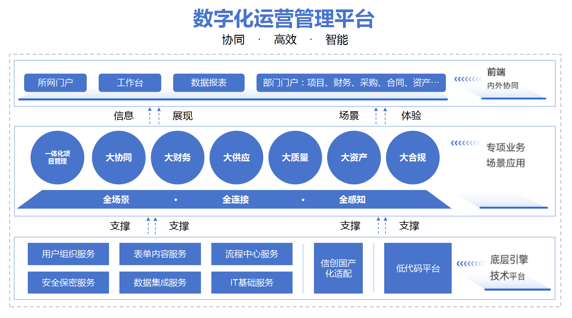 基于先进的微服务架构(Spring Cloud/Spring Boot+Vue)和低代码开发平台,构建了基于信创基座的统一的数字化运营管理平台。实现了以项目主轴、贯通大协同、大财务、大供应、大质量、大资产、大合规等管理活动的全面数字化。平台支持“零代码”快速构建简单业务,“低代码”复用共性组件,大幅提升了业务响应速度,实现了跨系统、跨部门的高效协同,见图2数字化运营管理平台框架图。