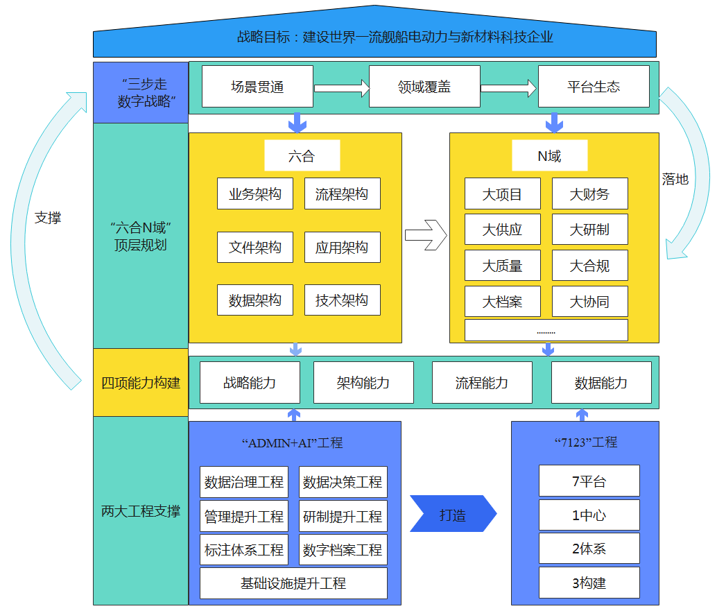 本案例针对军工科研院所“产研一体”复杂的业务形态及数字化转型中存在的“两张皮”、数据孤岛等痛点,以“建设世界一流舰船动力与新材料科技企业”为战略目标,创新性地构建了基于WIMEP•OS多维架构的“六合N域”数字化运营管理体系(如图1所示)。通过实施“ADMIN+AI”与“7123”专项工程,打通了业务、流程、数据等六大架构,实现了研发、生产、管理全链条的数智化覆盖。