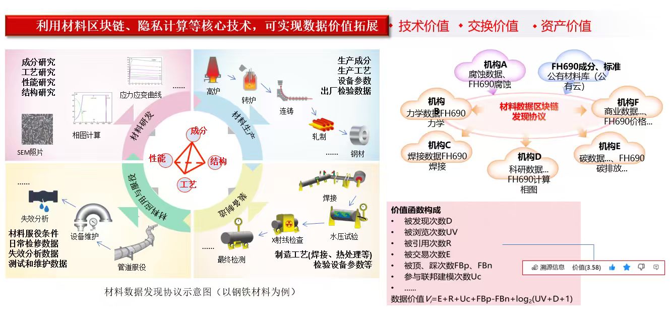 项目首创“成分-性能-结构-工艺”四面体特征数据发现模型,解决传统检索效率低的问题;同时融合区块链、隐私计算等技术,对不同密级数据实行分级共享,平衡价值释放与隐私保护;研发“材小链”数据路由舱,操作效率较传统方案提升3倍。同时,结合“技术-运营-监管”规则体系,保障数据流通合规高效。目前项目已形成7大类100余个数据集、API服务及智能工具等标准化产品,覆盖材料产业链全生命周期10+场景,可广泛服务于钢铁、石化等多领域企业,帮助企业将研发周期缩短50%,生产稳定性提升15%,试制成本降低20%,维护成本减少30%,显著提升全产业链协同效能。