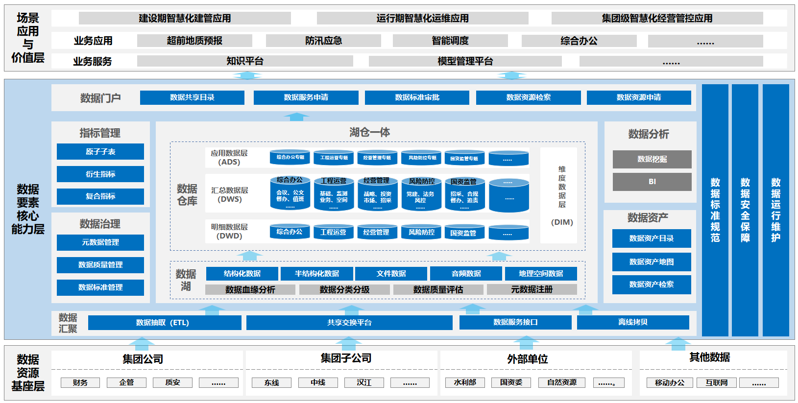 作为数据价值的最终出口,该层聚焦工程全生命周期智慧管理与集团数字化转型两大方向,在建设期支撑数字孪生工程建管,在运行期赋能精准调度与应急处置,同时覆盖集团办公、经营等业务的全功能监管,实现了数据要素在实际场景中的高效应用。