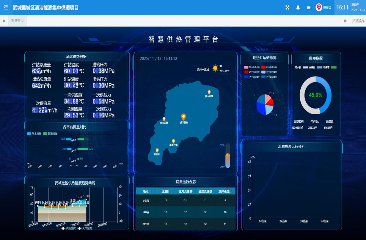 全链路物联网感知:在各地热井、换热站、关键管网节点部署1000+个传感器,实现对温度、压力、流量等关键参数的秒级实时采集与传输。