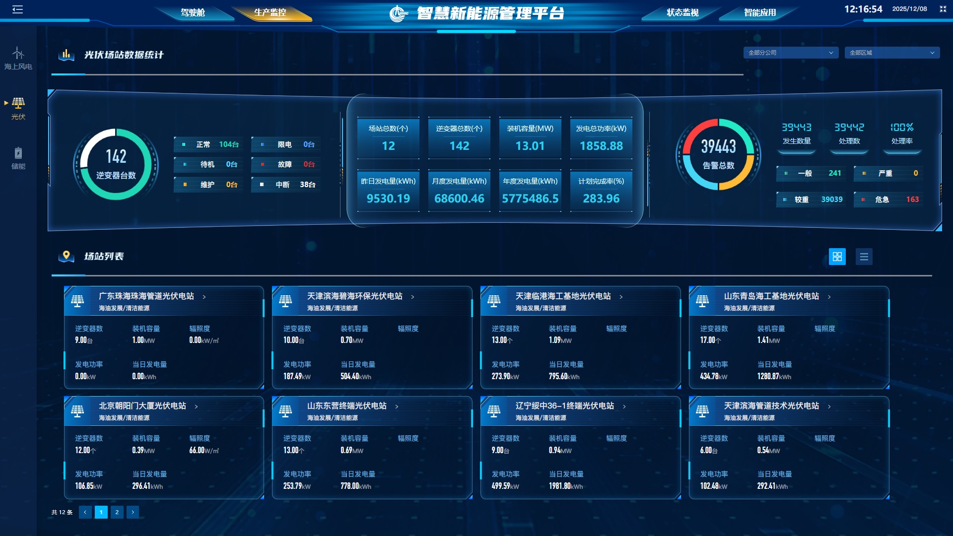 领导驾驶舱:为集团、区域公司领导提供宏观运营指标(如总装机容量、实时功率、累计发电量、场站分布等)的可视化展示,实现“一屏知全局”。