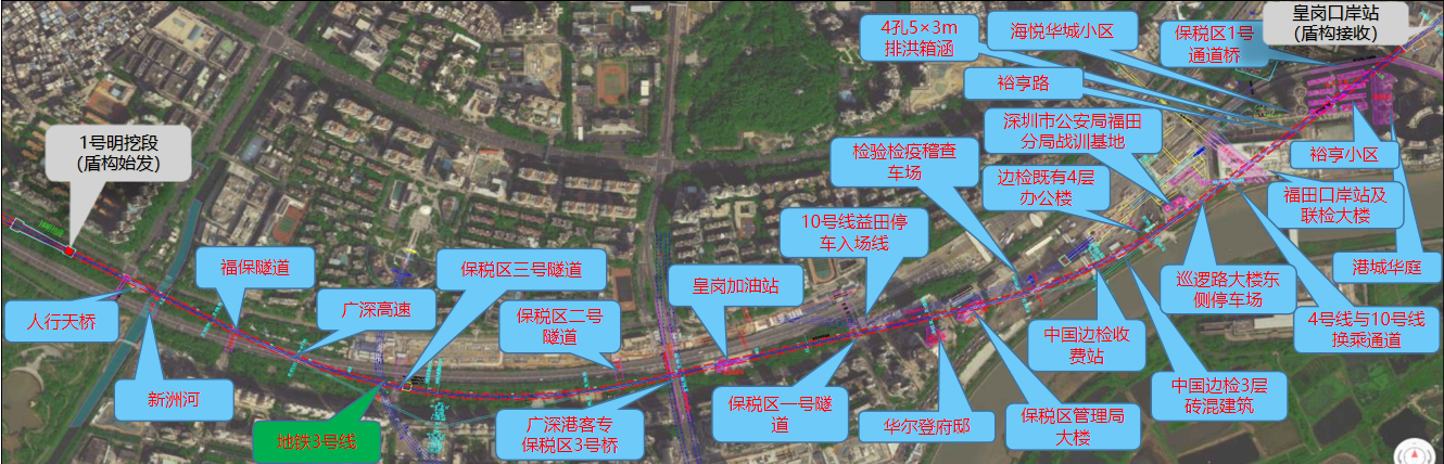 穿越风险源众多且风险等级高:区间穿越风险源共计28处,其中较大(Ⅰ级)风险源3处(广深高速、地铁3号线、保税区三号桥),较大(Ⅱ级)风险源17处,一般(Ⅲ级)风险源8处。