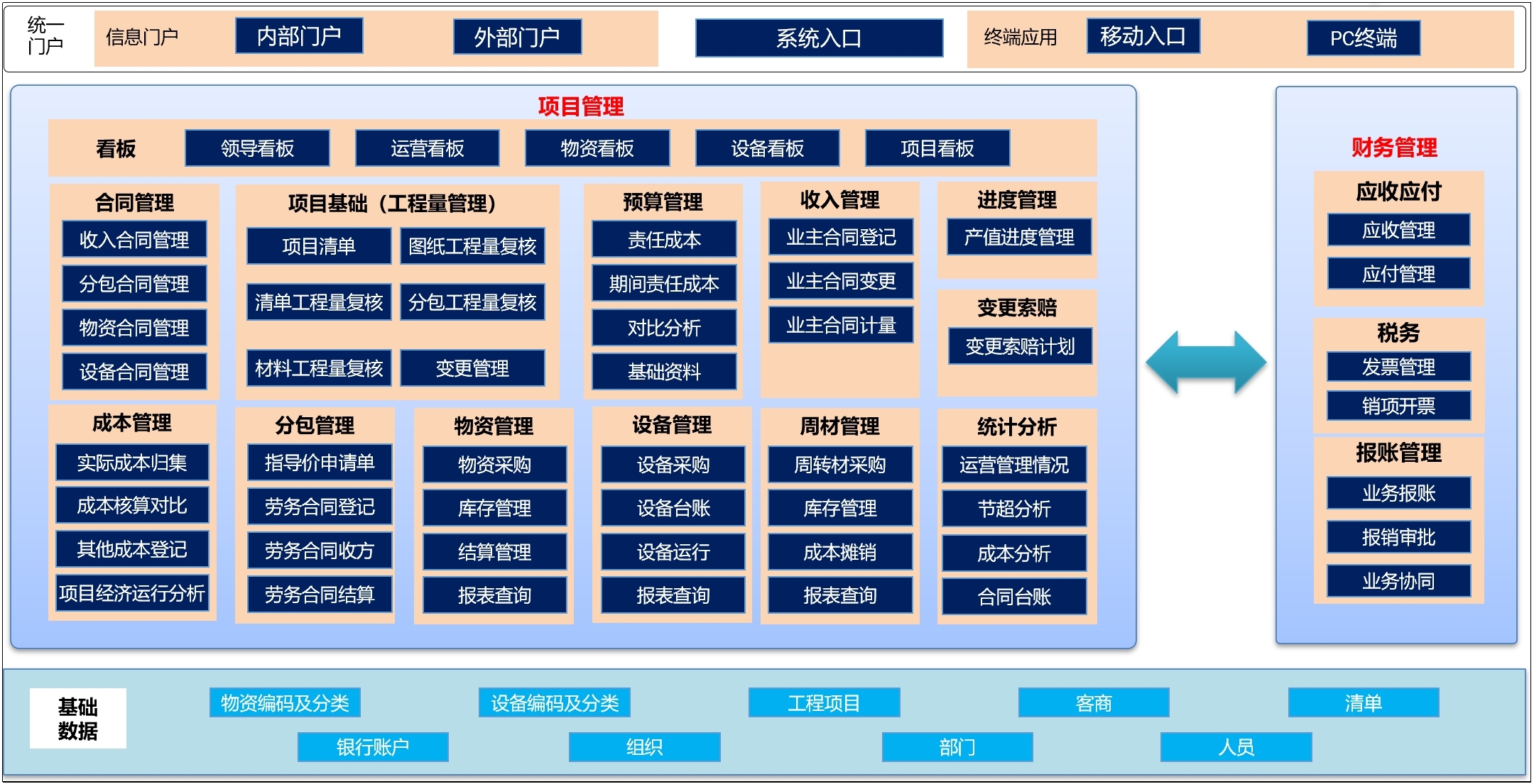 云程2.0成本系统,按照“整体规划、成本先行、业财融合、数据驱动”的设计理念,基于物联网,大数据,AI赋能的技术平台,搭建成本管理、合同管理、预算管理、收入管理、分包管理、设备管理、周材管理等11大核心模块、200余项功能子系统,实现核心业务数据跨部门实时共享,横向穿透各部门、纵向穿透各层级,全流程透明可视。聚焦管控细节,以标准化流程与精细化核算消除浪费冗余,实现成本最优。面对设计变更、价格波动等情况,系统通过模块化配置快速适配需求,确保成本管控与业务同频。