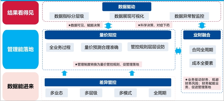用数字化手段促进项目前台成本精细化管理落地,公司后台集约化管控;各层级相互穿透,各环节内控透明。以项目盈亏和责任指标管理为核心,以量价费金控制为抓手,实现全部上线、来源唯一、数据实时、结果真实、预警及时、分析可视。