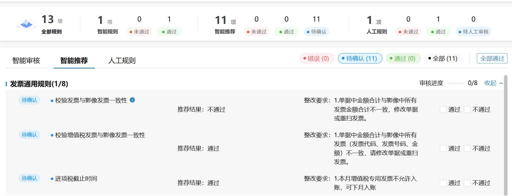 (3)智能推荐规则人工结果根据推荐结果进行默认。单据保存后调用智能审核进行规则计算,当推荐结果为通过或不通过时,则人工结果根据推荐结果进行默认。财务人员在进行单据审核时,可重点关注人工结果为不通过的规则。如果单据在流转的过程中,单据信息和影像信息发生了变化,则需要重新调用智能审核进行规则计算,并对人工结果进行更新。