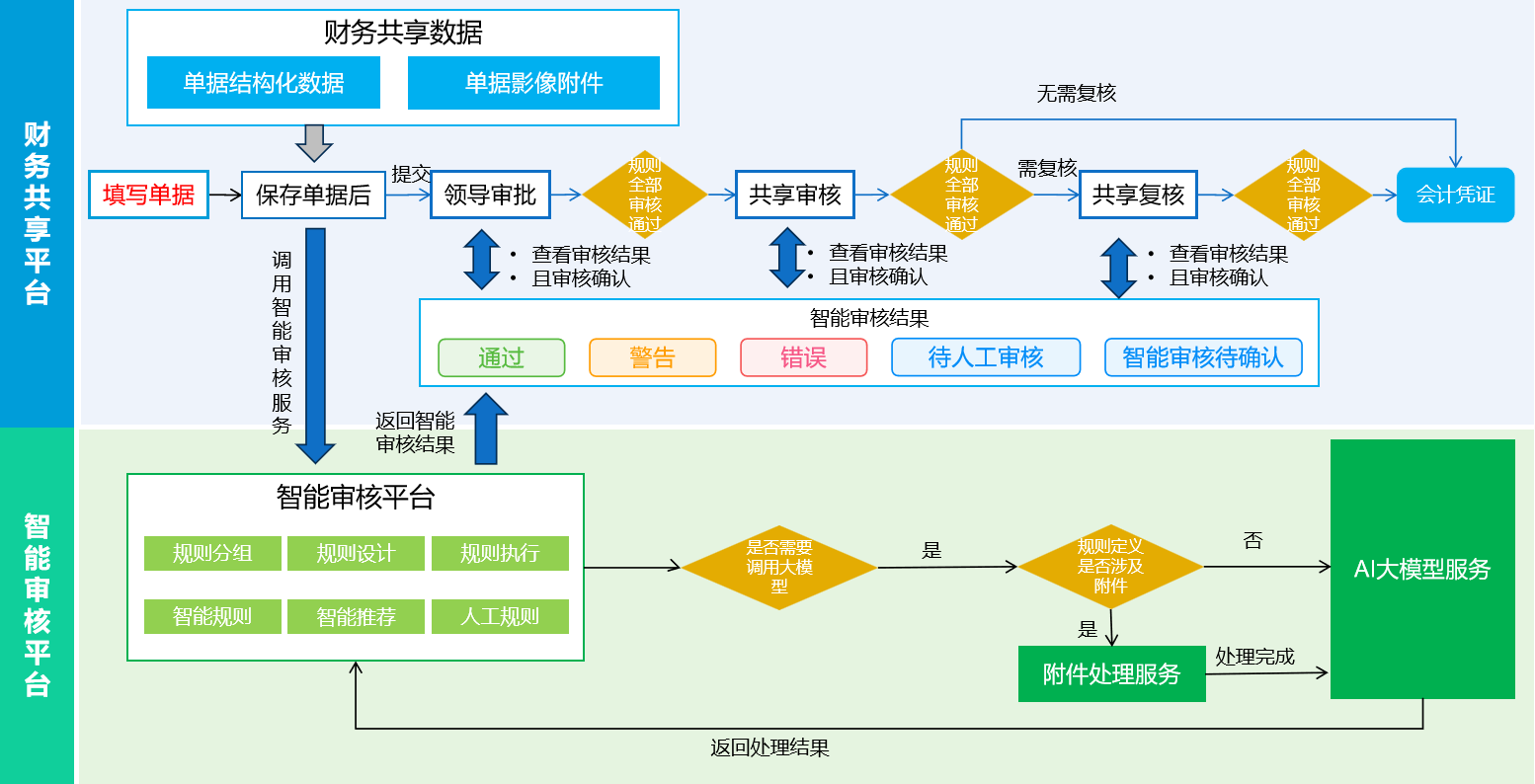 (3)智能审核服务根据单据关键信息进行规则执行,通过规则引擎及大模型计算出智能审核结果。