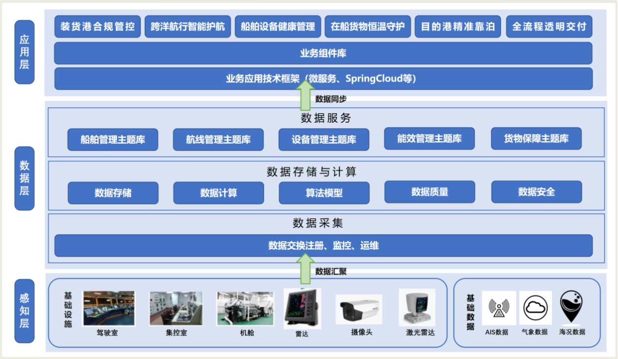 感知层:通过在船舶关键部位部署智能传感器、高清摄像头、本安智能终端等设备,结合AIS、雷达、气象系统、行为感知、态势感知系统等数据源,实现对船舶航行状态、设备运行参数等数据的全面采集。