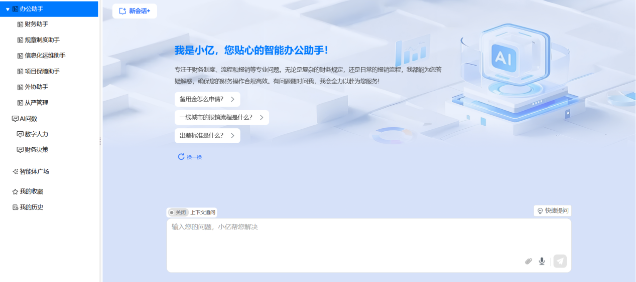 整合企业分散知识,构建统一知识库并实现权限管控,打造6大办公助手行政、财务、信息化运维、项目保障、从严管理、外协,解决“办事找人难、信息查得慢”问题。核心能力包括: