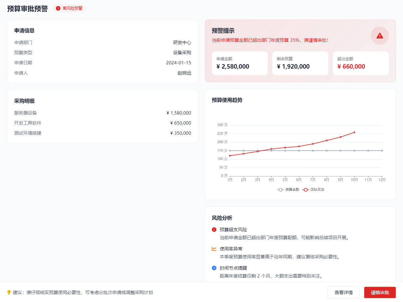 上下文感知合规检查:系统自动识别审批单关键参数(如费用金额、申请周期),关联企业合规标准,提示超标风险,如“该审批单试验费用超出近6个月同类项目平均值15%,需补充说明”;