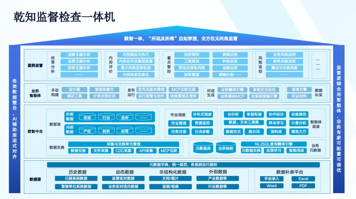 一体机以高性能硬件为基础支撑,内置开源大模型与乾知监督检查智能体平台,集成知识库管理、资料自动整理与抽取、数据智能接入、智能问答、智能问数、智能审核评价、资料核查比对、文数一致性检查、问题发现与线索分析、深度研究报告、多维分析报告等功能,形成“硬件适配+软件协同”的架构体系: