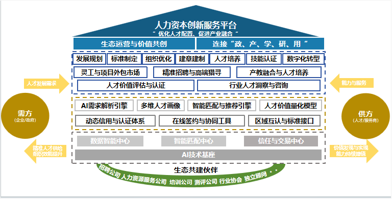 为实现此目标,平台将构建一个连接“政、产、学、研、资、用”六方的开放式生态网络,集成交易、认证、增值、洞察四大核心功能。运用先进的人工智能技术,实现对产业需求的深度解析,并与人才的多维度能力画像进行精准、智能的匹配。