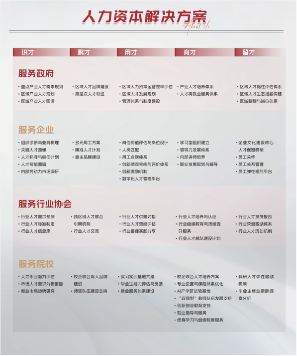 2)赋能产业(产):为企业提供从“找对人”到“用好人”再到“培养人”的一站式解决方案,降低用人成本,提升组织效能。