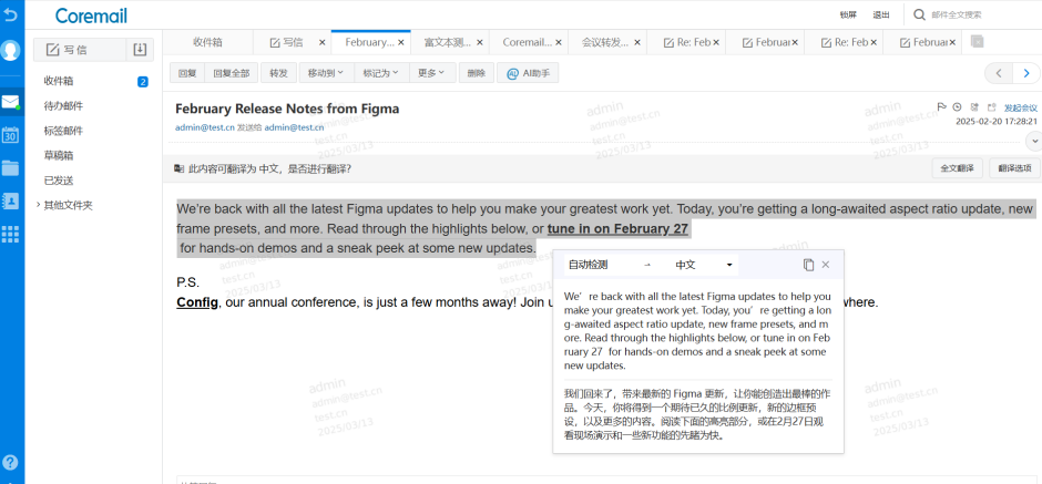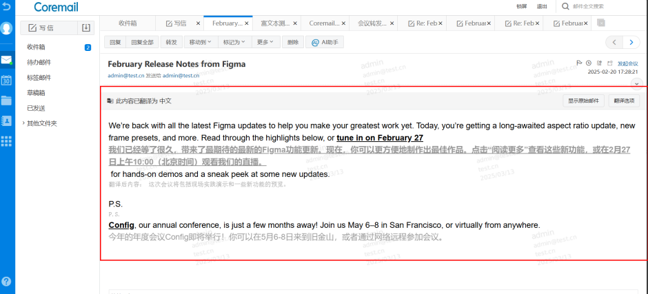 4、邮件智能总结:通过AI扫描邮件内容,无论是长文本邮件还是多轮会话邮件,可自动生成要点总结,在不细读整封邮件的情况下迅速掌握核心内容,便于用户进行下一步处理。