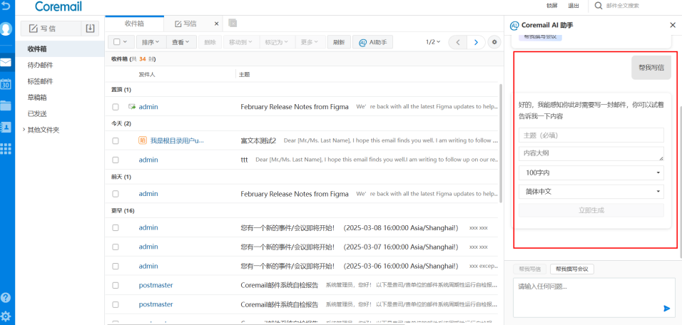3、邮件智能写信:一句话输入需求,AI助手摘取关键信息一键生成新邮件,在回信场景中,还可通过分析上下文和用户输入提示,针对性回复。根据不同场合需要,用户可使用改变语气妥帖回复。续写、扩写、缩写、改写,多种文章润色能力为内容锦上添花。
