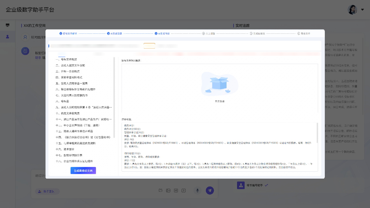生成式AI与合规校核模块是主要用于在标书编写过程中提供智能生成、语言优化以及多维度的合规性检查,确保投标文件内容的完整性、准确性与合规性。智融创新联盟邀请了法律顾问机构和资质认证单位参与合规校验规则的制定,确保了校验标准的全面性与权威性。