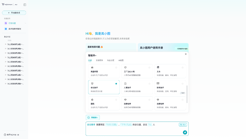 1.行政办公智能体:聚焦会议管理、假期审批两大办公核心场景,打造全流程智能化服务闭环。会议助手支持通过自然语言指令完成全流程操作,包括会议预订时自动识别参会人日程、推荐常用会议室,会议期间实时同步议程,会议变更、取消并更新跨平台日程;同时提供会议室占用情况可视化看板,支持按时间、地点等多维度检索,集成飞书、岚图OA系统实现日程跨系统同步,彻底解决会议组织“多步操作、信息不同步”的痛点。请假助手深度打通岚图OA系统,覆盖调休、事假、病假等全类型假期管理,员工可一键发起申请、撤回申请,实时查询假期余额及审批节点进度,让假期管理“申请快、查询准、流程透”。