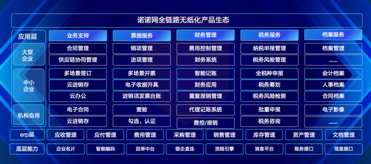 诺诺网打造的企业全流程无纸化办公整体解决方案,积极响应国家“十四五”规划中产业数字化转型的相关要求,通过运用人工智能、云计算、区块链等技术,打通企业端从业务发起到结束的全流程,实现线上审批、线上签约、线上报销、线上入账、线上归档。涉及领域包括:交通运输、能源基础设施、城市基础设施、智慧政务、民生保障、工业互联网、数字农业等。诺诺网还作为电子凭证会计数据标准深化试点工作的技术支持单位和产品方案提供商,同时还承担电子凭证开具分发平台、代理记账平台及财务云平台等平台类试点任务,一直深度参与到电子凭证会计数据标准试点的前期准备、运行、推广及后续技术支撑的重要工作中,在政府、企事业单位和银行领域树立了多个行业标杆案例。