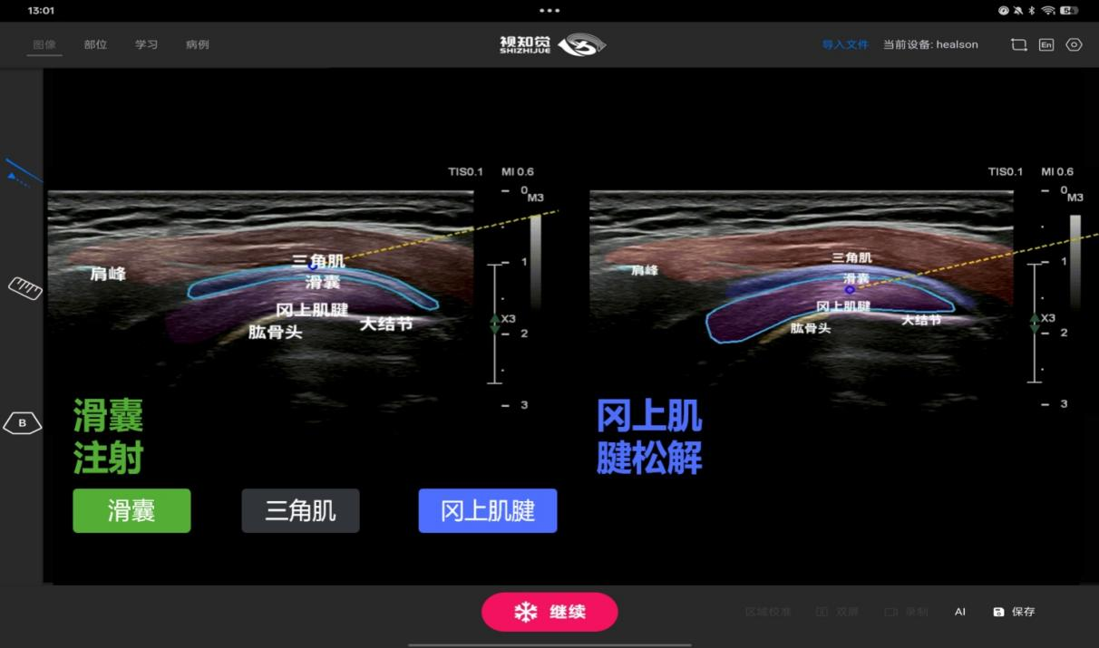 本AI软件通过辅助教学模块中的标准切面扫图辅助与实时切面识别提醒,在扫查过程中即时规范医生手法,将质控环节前置,从源头提升图像质量与诊断可靠性。并集成交互式治疗引导与全新的神经阻滞模块,实现从“看得准”到“打得准”的跨越,为精准麻醉与疼痛治疗提供一站式解决方案。