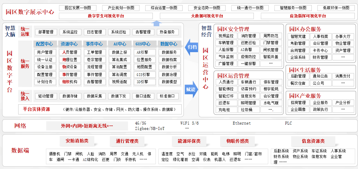 五大能力中心:统一接入(兼容18类子系统)、统一认证(分级授权)、AI中心(教育算法适配)、GIS中心(教学设施定位)、数据中心(师生-教学数据关联),均为智慧园区通用模块,仅调整数据字段适配教育场景。