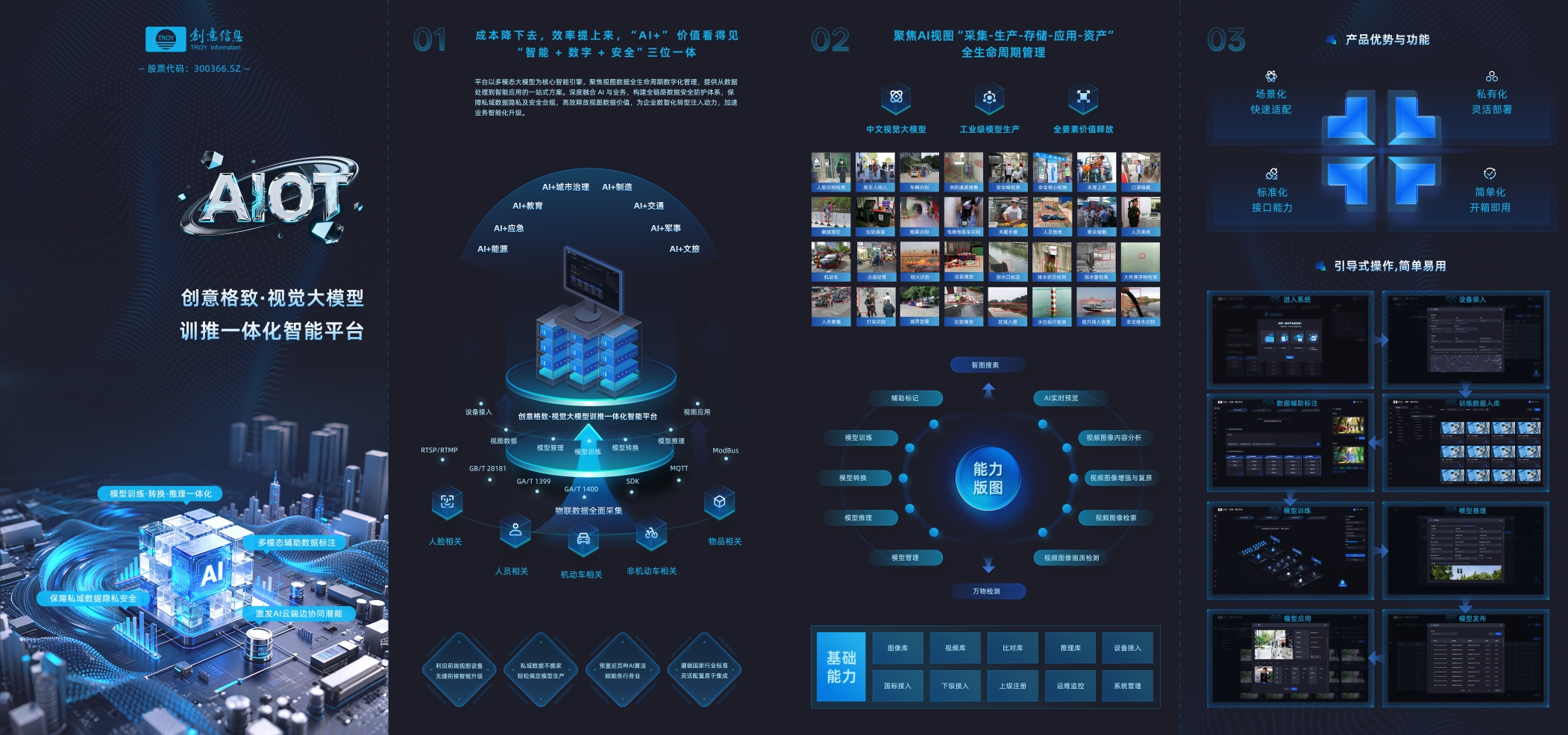针对当前视觉AI领域存在着作坊式开发、模型泛化性差、迭代周期长、算力利用率低等痛点,公司打造了“创意格致·视觉大模型训推一体化智能平台”。该平台以多模态大模型技术为基础,面向视图数据的全生命周期,提供数据采集、语义建模、模型训练、模型推理和语义检索等能力。设备搭载国产高性能AI计算卡,基于全栈国产软硬件平台开发,具有低功耗、高计算密度、开箱即用等特点;同时,通过冷启动与少样本快速迭代高精度模型的能力,实现算法需求快速响应。