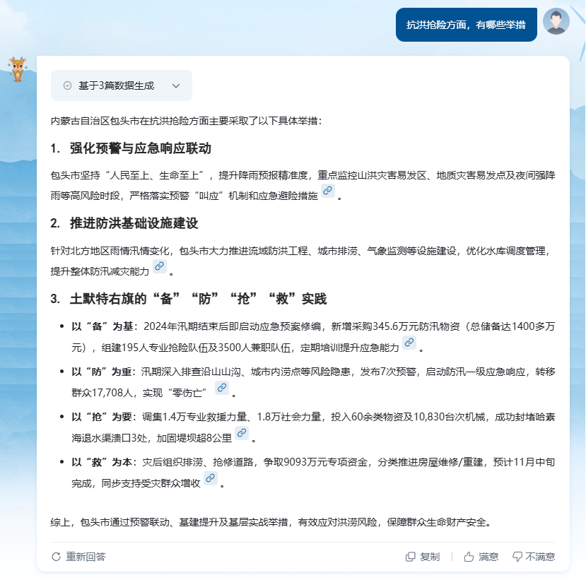 支持模糊查询与多维度筛选,例如用户搜索“抗洪抢险措施”,系统可实时抓取包头市防汛预警、基础设施建设、灾后重建等相关信息,整合为“预警联动-物资储备-抢险救援-灾后恢复”的结构化报告,而非零散的文件链接。