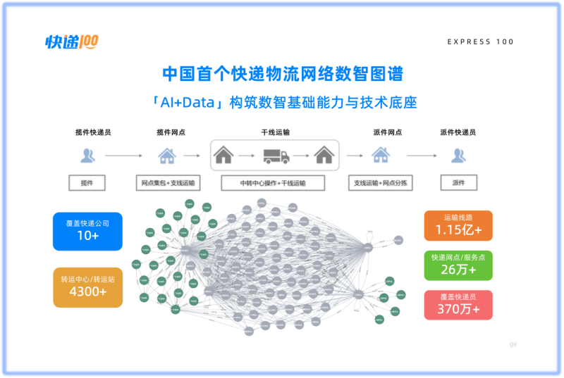 为解决这一问题,快递100于2025年6月13日在“连接未来的技术架构——GIAC全球互联网架构大会”正式发布“中国首个快递物流网络数智图谱”。该图谱结合AI大模型和大数据,对快递网点、快递员、运输节点等半结构化数据进行处理,将其结构化并形成一个完整的物流关系网络,多轮优化机器学习算法,以节点形式提取特征,并对数据进行聚类处理,使其更具明显的时间等属性特征,从而发现和抽象其中隐藏的规律。