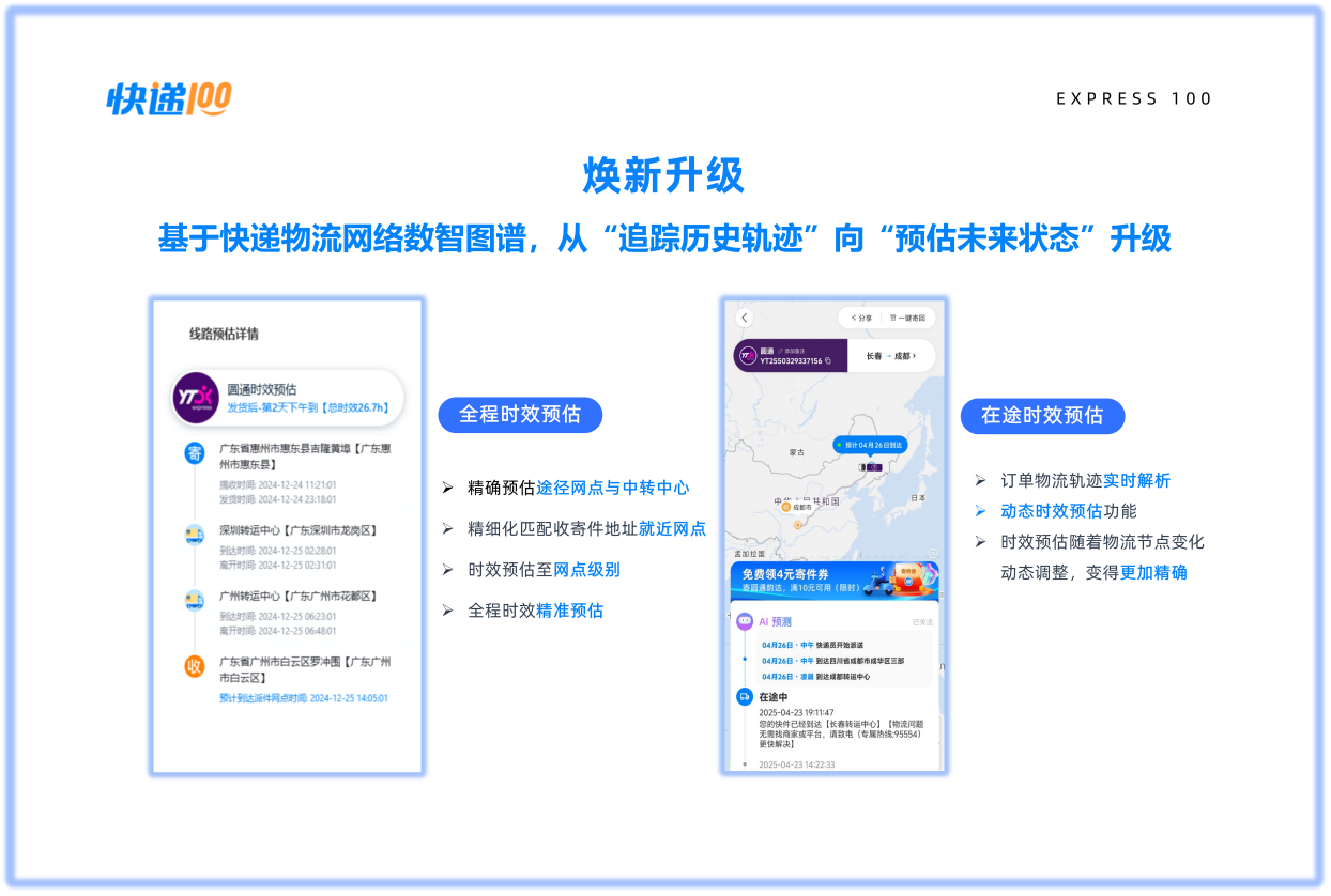 为应对当前快递时效预测方法简单、无法适应动态变化等行业痛点,快递100于2025年发布了结合AI与大数据的“中国首个快递物流网络数智图谱”。基于该图谱,快递100焕新升级旗下「百递云•API开放平台」产品,推出智能时效预估能力,提供发货前的“全程预估”和发货后的“在途预估”两种模式,实现了更精准的动态预测。