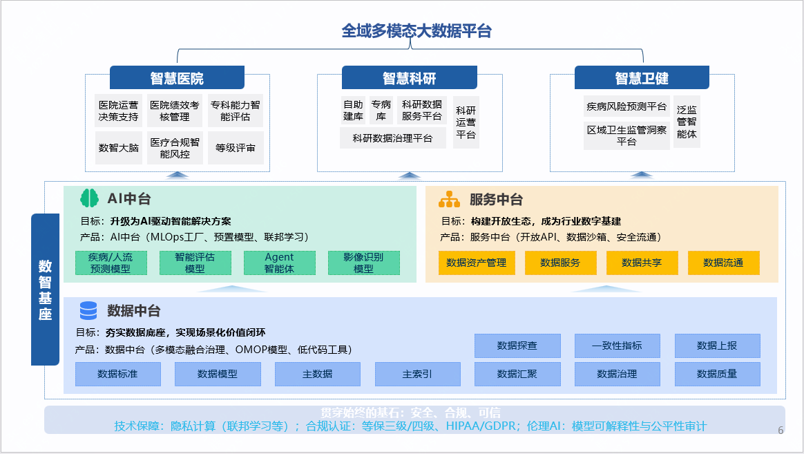 ·“1”即一个“数智基座”:包括数据中台、服务中台及AI中台,实现医疗健康多模态数据汇聚与高效数据治理,强化数据资产管理、数据资源开放共享与AI融合创新,以数智新基建让数据更快发挥价值。